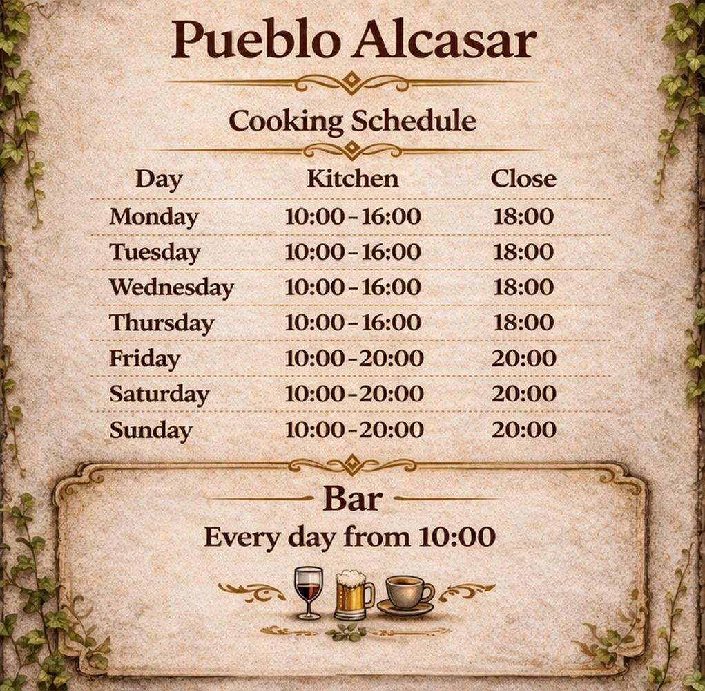 Teléfono | Telephone: +34 601 536 939 E-mail: restaurantepuebloalcasar@gmail.com